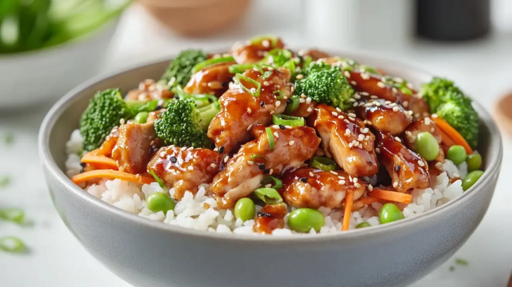 For the best 15-minute chicken rice bowl, cook small pieces of chicken in a hot skillet, add quick-cooking vegetables, then toss everything in a simple sauce made with soy sauce, honey, garlic, and a little sesame oil. Serve it over warm cooked rice for a fast, balanced dinner that feels fresh and comforting.