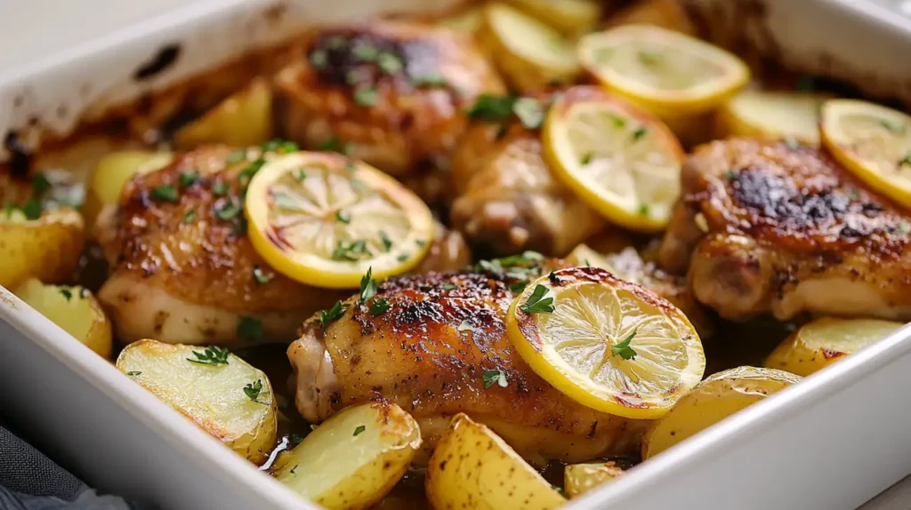 One-pan lemon chicken and potatoes served in a rustic baking dish with lemon slices and parsley